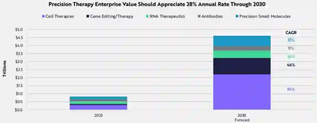 Big Ideas 2024 在过去的二十年里,精准治疗、CRISPR基因编辑、RNA治疗和靶向蛋白质降解的新模式已经激增。由人工智能(AI)、CRISPR基因编辑和新测序技术驱动的创新疗法增加了研发(R & D)的回报,同时使不可药物治疗的目标变得可药物治疗。 过去的十年来,生物工具和技术的数量激增,能力有了显著提高。其中有三种使能力脱颖而出:高通量蛋白质组学、人工智能和单细胞测序。 根据ARK投资研究公司的预测,越来越多的精准疗法正在成为多学科和治愈性的,其作用机制涵盖DNA,RNA蛋白质等。根据ARK的研究,专注于精准治疗的公司的企业价值在未来七年内可能会以每年28%的速度增长,从2023年的8200亿美元增长到2030年的4.5万亿美元。