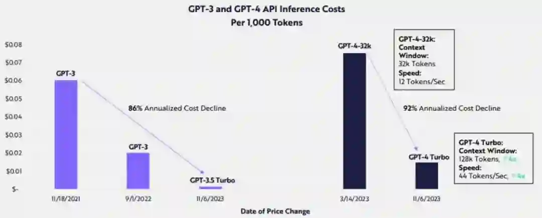 Big Ideas 2024 人工智能模型会催化前所未有的生产力繁荣,生产力到2030年翻两番,GDP的增长可能会加速,并在未来五到十年内打破纪录。 ARK指出,随着开源替代品的出现和成本的下降,AI所应用的领域将扩大,研究人员也会在AI训练和推理、硬件和模型设计方面进行创新,推理成本会以每年约 86% 的速度下降。预计到2030年,硬件和软件的融合可以使AI培训成本以每年75%的速度下降。 ARK认为到2030年,AI有潜力让知识驱动的职业中的多数任务实现自动化,从而大幅提高员工的生产力。