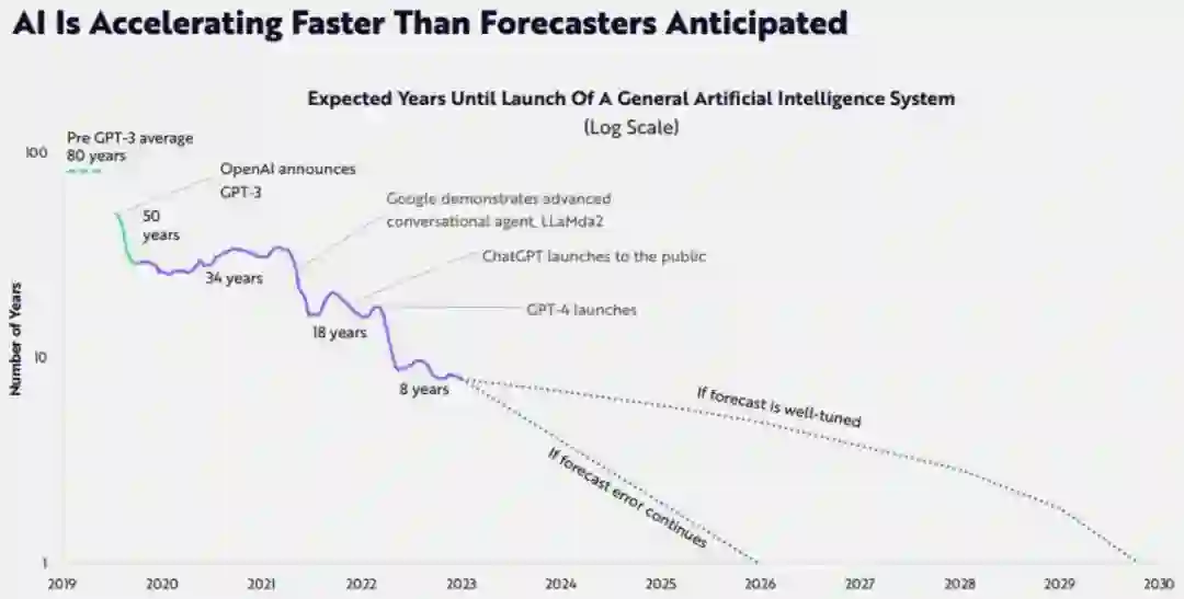Big Ideas 2024 ARK的研究指出,颠覆性技术之间的融合是未来十年的重点,其中人工智能、公有区块链、多组学测序、储能和机器人技术五大技术平台,正在掀起的历史性浪潮,将重新定义这个时代。影响力远超第一次和第二次工业革命。 AI的发展速度超出了人们的预期,通用人工智能技术的发展一直在加速,从2019年预期需要80年才能推出,到2023年时该预期已经变成了8年,此前预测AI技术要到2030年才能成熟应用,但如果预测误差继续存在,也许到2026年就能实现目标。 颠覆式创新公司在全球股市的占比将从16%增加到60%以上,未来几年的年回报率可能超过40%,其市值将从今天的19万亿美元增加到2030年的220万亿美元。