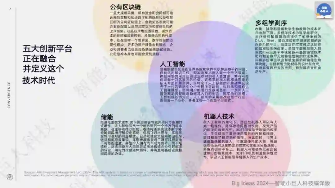 近日,被誉为“科技投资女王”的华尔街明星基金经理、方舟投资管理公司的首席执行官“木头姐”凯茜·伍德(Cathie Wood)带领她的ARK研究团队发布了《Big Ideas 2024》报告。自2017年以来,其团队每年发布的《Big Ideas》报告更是以极高的含金量,成为全球科技创业者与投资者的重要参考资料。 这份长达163页的报告,ARK从技术融合、人工智能、比特币、智能合约、精准治疗、多组学工具和技术、电动车、自动驾驶出租车、机器人技术、自主物流、可回收火箭和3D打印等方面对技术融合及其变革行业和经济的潜力进行了全面分析。