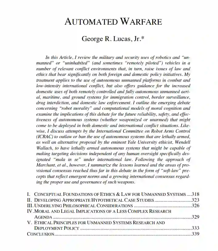 这篇文章回顾了机器人技术和 "无人驾驶 "或 "不载人"(有时是 "遥控")系统在一些相关冲突环境中的军事和安全用途,这反过来又提出了对外交和国内政策举措有重大影响的法律和道德问题。本文处理方法适用于自主无人平台在战斗和低强度国际冲突中的使用,但也为美国国内越来越多地使用遥控和完全自主的无人驾驶航空、海洋和地面系统进行移民控制、边境监视、毒品阻截和国内执法提供指导。本文概述了有关 "机器人道德 "和道德认知的计算模型的新辩论,并研究了这一辩论对未来可能被部署在国内和国际冲突情况下的自主系统(无论是武器化还是非武器化)的可靠性、安全性和有效性的影响。同样,讨论了国际机器人军备控制委员会(ICRAC)试图取缔或禁止使用带有致命武器的自主系统,以及耶鲁大学知名伦理学家Wendell Wallach提出的另一项建议,即带有致命武器的自主系统可能能够独立于任何人类监督做出目标决定,根据国际法特别指定为 "本身无效"。然而,按照Marchant等人的做法,本文总结了迄今为止在这场辩论中所吸取的教训和达成临时共识的领域,其形式为 "软法(soft-law)"规则,反映了关于此类武器的适当使用和治理的新兴规范和日益增长的国际共识。