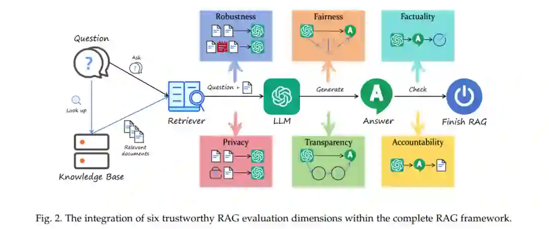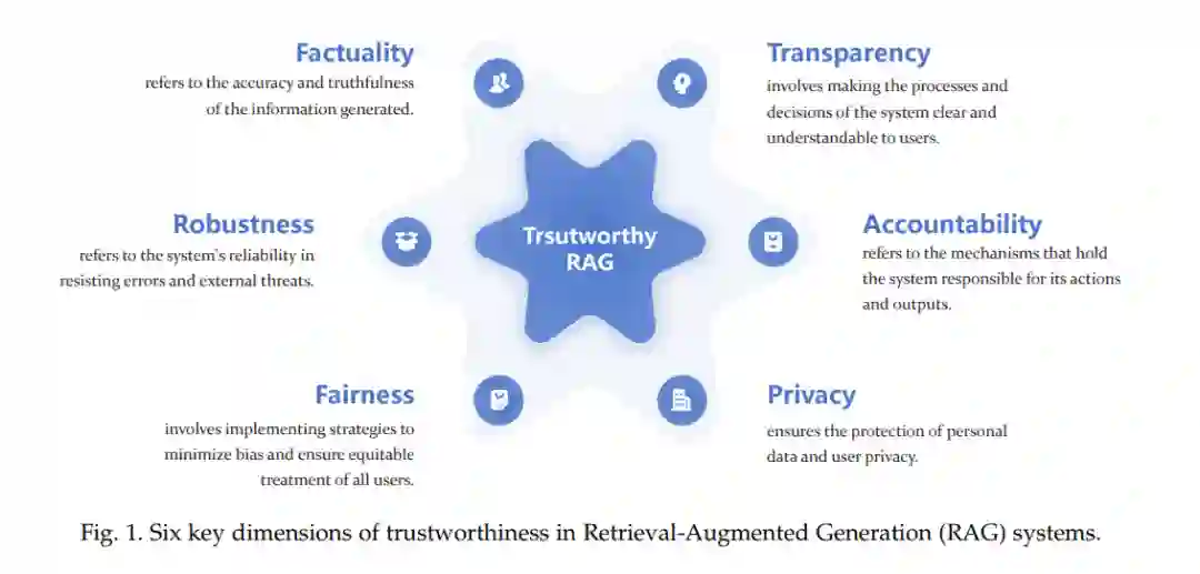 RAG系统可信度六个关键维度的定义:如图1所示,我们从六个维度定义了RAG系统的可信度:(1)真实性:通过与可靠来源进行验证,确保生成信息的准确性和真实性。(2)鲁棒性:确保系统对错误、对抗性攻击和其他外部威胁的可靠性。(3)公平性:在检索和生成阶段尽量减少偏见,确保公平的结果。(4)透明性:使RAG系统的过程和决策对用户清晰易懂,促进信任和问责。(5)问责性:实施机制,确保系统的行为和输出负有责任且可追溯。(6)隐私性:在检索和生成过程中保护个人数据和用户隐私。