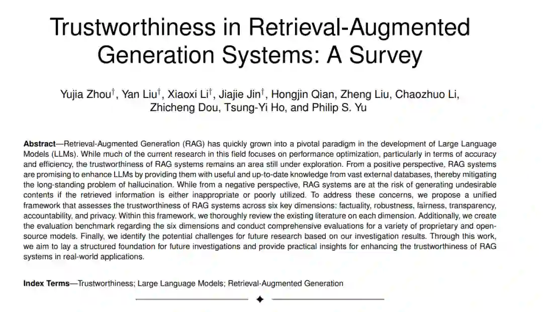 摘要—检索增强生成(RAG)已迅速成为大规模语言模型(LLM)开发中的关键范式。尽管当前该领域的大部分研究主要集中在性能优化,尤其是在准确性和效率方面,但RAG系统的可信度仍是一个尚待深入探索的领域。从积极的角度来看,RAG系统有望通过从广泛的外部数据库中提供有用的、最新的知识,增强LLM的能力,从而缓解长期存在的幻觉问题。而从消极的角度来看,如果检索到的信息不合适或使用不当,RAG系统有可能生成不良内容。为了解决这些问题,我们提出了一个统一框架,用于从六个关键维度评估RAG系统的可信度:真实性、鲁棒性、公平性、透明性、问责性和隐私性。在此框架下,我们全面回顾了现有文献中对每个维度的研究。此外,我们针对这六个维度创建了评估基准,并对多种专有和开源模型进行了全面评估。最后,基于我们的调查结果,我们确定了未来研究可能面临的挑战。通过这项工作,我们旨在为未来的研究奠定一个结构化的基础,并提供提升RAG系统在实际应用中可信度的实用见解。