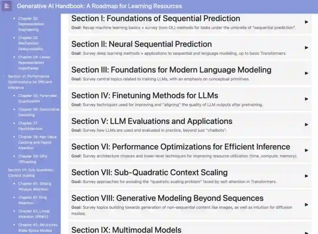 本文件旨在作为学习现代人工智能系统关键概念的手册。鉴于最近AI发展的速度,目前还没有一本系统的教科书来快速掌握LLMs或其他生成模型的最新创新,但互联网上有大量优秀的解释资源(博客文章、视频等)。我的目标是将这些“最佳”资源组织成教科书式的呈现,作为实现个人AI学习目标的路线图。我希望这将成为一个“活文档”,随着新创新和范式的出现不断更新,并且理想情况下能从社区输入和贡献中受益。本指南面向那些具有一定技术背景、对AI感兴趣或有潜在职业需求的人。我假设你有一些编码和高中数学的经验,但我也会提供填补其他前提条件的指引。如有任何你认为应该添加的内容,请告知我! https://genai-handbook.github.io/#