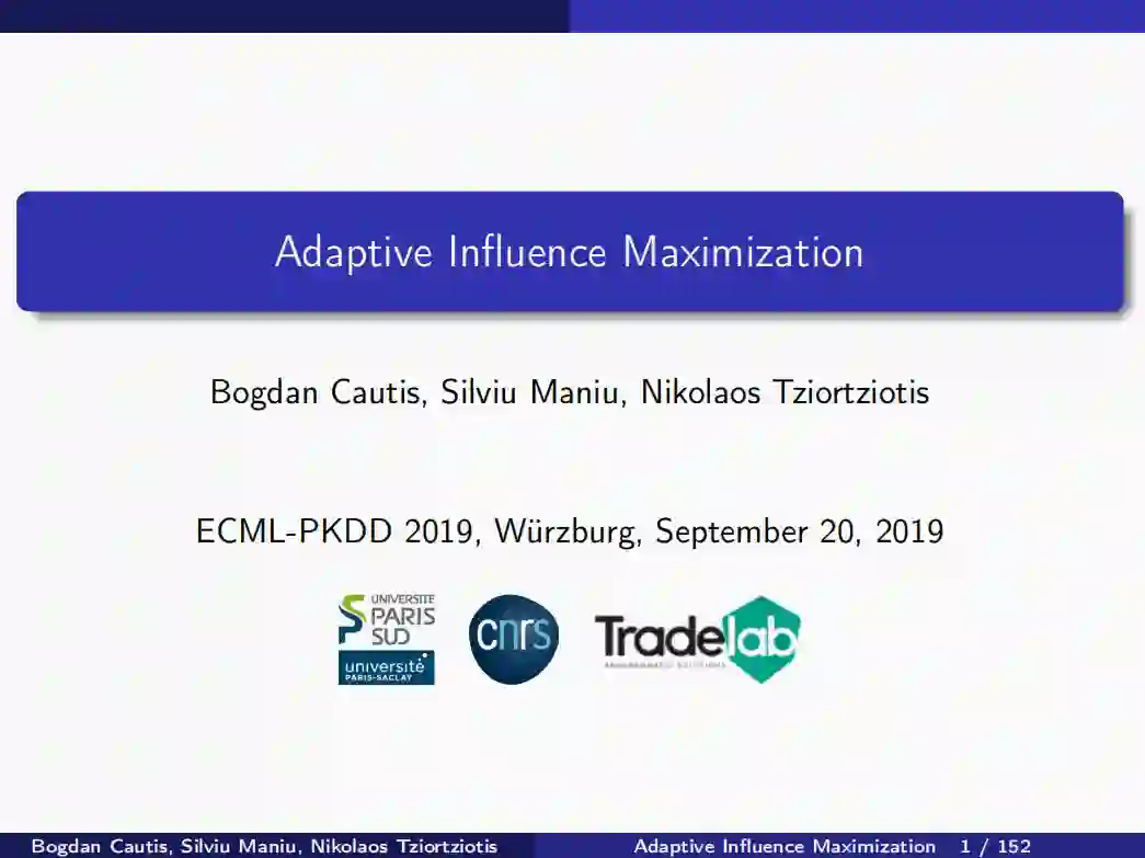 在本教程中,我们打算介绍自适应影响最大化的最新研究,旨在解决这些限制。这可以被视为一种特殊情况下的影响最大化问题(种子在社会图选择最大化信息传播),一个决策作为影响运动的展开,在多个回合,知识图拓扑结构和影响过程甚至可能部分或完全缺失。这种设置,取决于基本的假设,导致变量和原始的方法和算法技术,正如我们在最近的文献中看到的。我们将回顾这一领域最相关的研究,按照几个关键维度进行组织,讨论这些方法的优点和缺点,以及开放式研究问题及其实施的实际方面。