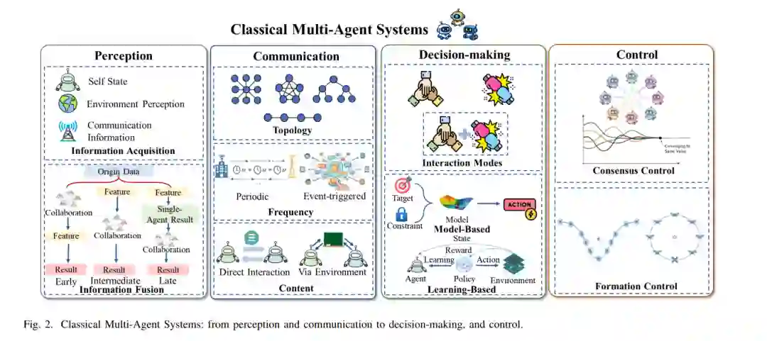在本综述中,未融入大基础模型(LFMs)的 MASs 统称为经典多智能体系统(CMASs) [9], [10]。CMASs 依赖于显式设计的系统模型或特定任务的学习机制。从方法论角度看,现有的 CMASs 研究大致可分为基于模型的方法和基于学习的方法。基于模型的研究已逐步确立了多个经典问题领域和理论框架,包括一致性控制 [11]、编队控制 [12]、任务调度 [13] 以及生物启发优化 [14]。这些研究通常假设系统可建模且目标明确,以确保可证明的稳定性和性能 [9]。然而,在环境不可建模、系统动力学未知及部分可观测的场景下,依赖显式建模和控制设计往往受到限制。因此,诸如多智能体强化学习(MARL)等基于学习的方法作为重要的替代方案应运而生,使智能体能够在无需精确模型的情况下,通过交互学习协作策略 [15]。虽然这一范式部分缓解了复杂环境下的模型依赖问题,但 MARL 在采样效率、稳定性、可解释性和泛化性方面仍存在局限性 [16]。
