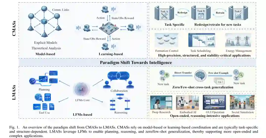 CMASs 的局限性激发了对具备推理能力的更通用方法的探索,从而促进了大基础模型(LFMs)与 MASs 的集成 [17]。在 MASs 背景下,LFMs 充当智能体的认知核心。它们使智能体能够解析非结构化的多模态输入、保持上下文理解、对复杂任务进行推理,并生成高层级的动作或交互信息 [18]。这使得智能体的运行从 CMASs 中预定义的系统模型、手工规则或特定任务策略,转向语义级感知和基于语言的交互,从而实现更灵活的协作 [19]。这一演进标志着从特定任务、环境受限的 CMASs 向更具自适应性、通用性且具备认知能力的基于大基础模型的 MASs(LMASs)的根本性范式转换。通过利用 LFMs 的预训练知识和推理能力,这些系统能够执行复杂的步进式规划、知识检索和高层级决策 [20], [21]。如图 1 所示,与为固定环境量身定制的 CMASs 不同,LMASs 具有良好的泛化性,并能跨任务积累经验,支持在开放、动态场景下的灵活协作 [22], [23]。