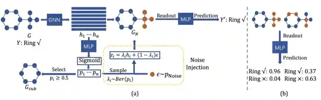 子图识别问题是指识别图结构数据中的与图属性有关的预测性子图。该问题是图神经网络可解释性分析、组织病理学分析以及鲁棒图分类等任务中的关键性问题。针对该问题,现有的方法通过优化图信息瓶颈目标函数来识别预测性子图。然而,由于互信息估计过程十分繁琐且难以准确估计,现有的方法训练耗时且不稳定,并极易得到退化解。因此,本文提出了变分图信息瓶颈方法。该方法首先引入噪声注入模块,对图数据中的节点依概率选择性注入噪声从而得到扰动图。通过比较扰动图与原始图预测结果的差别来衡量注入噪声节点的重要性。针对采样过程不可导,我们设计了基于重参数化技巧的噪声注入方法。通过引入噪声注入模块,我们将原始图信息瓶颈目标函数转化为变分图信息目标函数,并利用变分技巧得到了目标函数的变分上界。通过优化该变分上界求解图信息瓶颈问题,提高了优化过程的稳定性与速度。最后,将扰动图中的噪声节点去掉即得到了预测性子图。我们在多种视觉任务和图学习任务上测试了变分图信息瓶颈方法。实验结果表明该方法不仅易于优化,且在多种任务上取得很好的效果。