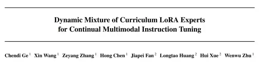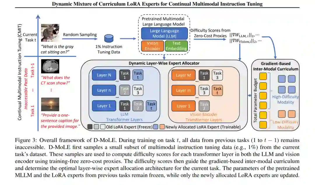 持续多模态指令微调对于使多模态大语言模型(Multimodal Large Language Models,简称 MLLMs)适应不断变化的任务至关重要。然而,大多数现有方法采用固定的模型架构,因其静态的模型容量,难以有效适应新任务。为此,我们提出在参数预算限制下进化模型架构以实现动态任务适应,这一方向尚未被充分探索,并带来了两个主要挑战:1)任务架构冲突:不同任务在层级适配上存在差异化需求;2)模态不平衡:不同任务对各模态依赖程度不同,导致更新过程不均衡。 为应对上述挑战,我们提出了一种新颖的方法:动态课程化 LoRA 专家混合机制(D-MoLE),该方法在受控参数预算下自动进化 MLLM 的架构,以持续适应新任务,同时保留已学知识。具体而言,我们设计了一种动态层级专家分配器,该模块可自动在各层之间分配 LoRA 专家,以解决架构冲突问题,并按层级方式路由指令以促进专家之间的知识共享。随后,我们进一步提出一种基于梯度的跨模态持续课程机制,该机制根据任务中各模态的难度调整 MLLM 各模块的更新比例,从而缓解模态不平衡问题。 大量实验表明,D-MoLE 在多个基准任务中显著优于当前最先进的方法,平均提升达 15%。据我们所知,这是首个从架构角度出发,对 MLLM 进行持续学习的研究。