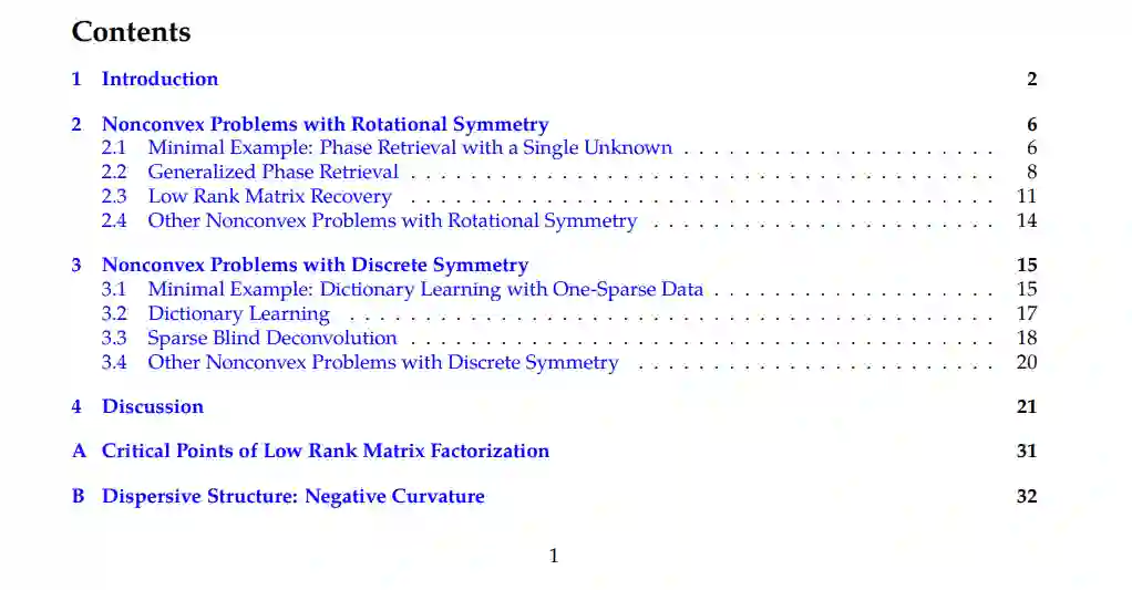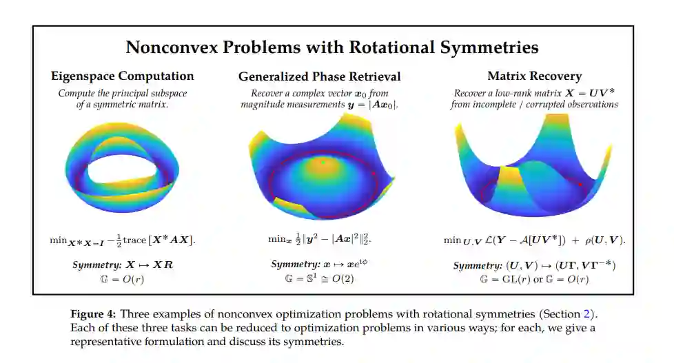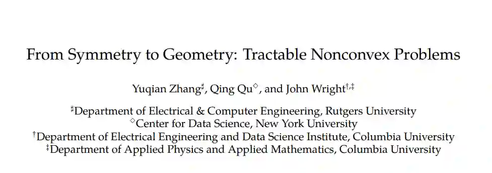 随着科学与工程越来越多地由数据驱动,优化的作用已经扩展到几乎数据分析流水线的每一个阶段,从信号和数据采集到建模和预测。实际中遇到的优化问题往往是非凸的。虽然挑战因问题而异,但非凸性的一个常见来源是数据或测量模型中的非线性。非线性模型通常表现出对称性,创造出复杂的、非凸的客观视角,具有多个等价解。然而,简单的方法(如梯度下降)在实践中往往表现得非常好。这一综述的目的是突出一类可处理的非凸问题,可以通过对称性的视角来理解。这些问题呈现出一种典型的几何结构:局部最小值是单一“真值”解的对称副本,而其他临界点出现在真值解的对称副本的平衡叠加处,并在打破对称性的方向上表现出负曲率。这种结构使有效的方法获得全局最小值。我们讨论了在成像、信号处理和数据分析的广泛问题中产生的这种现象的例子。我们强调了对称在塑造客观视角中的关键作用,并讨论了旋转对称和离散对称的不同作用。这一地区有很多观察到的现象和悬而未决的问题;最后,我们强调了未来研究的方向。