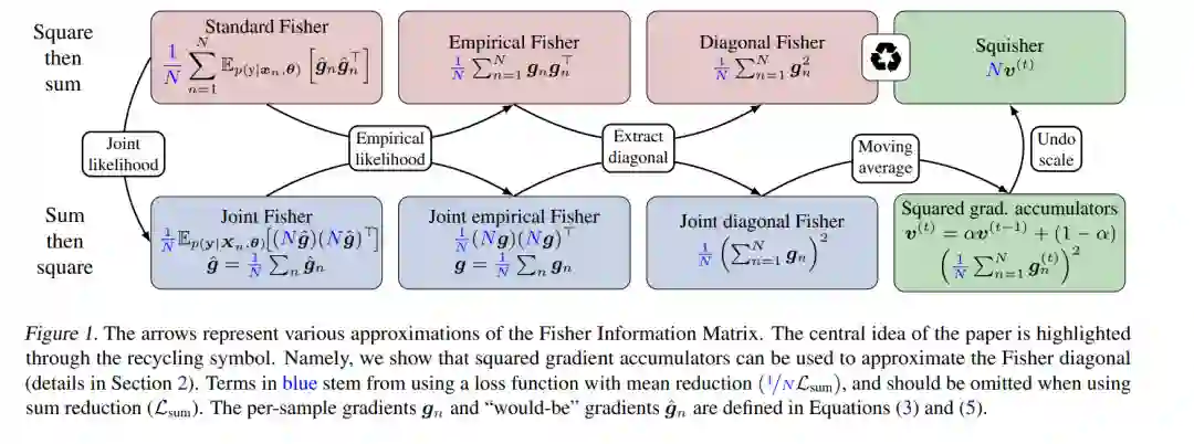 模型的Fisher信息矩阵的对角线部分(即“Fisher对角线”)常被用作衡量参数敏感性的一种方式。 通常,Fisher对角线是通过对模型似然函数关于其参数的梯度平方进行采样估计,并在几百到几千个样本上取平均而得到的——这一过程会带来不小的计算开销。与此同时,诸如广泛使用的Adam优化器这类自适应梯度方法,在训练过程中会计算梯度平方的滑动平均。 因此,本文探索了一个问题:是否可以通过“回收”在训练过程中已计算好的平方梯度累加器,从而“免费”获得Fisher对角线的近似值。 通过覆盖Fisher对角线五种应用场景的一系列综合实验证明,这种方法(我们称之为“Squisher”,即以平方梯度累加器近似Fisher)在表现上与Fisher对角线一致,并优于其他基线方法。 此外,我们还阐明了Squisher与Fisher对角线之间的具体差异,并对它们各自的影响进行了实证量化。
