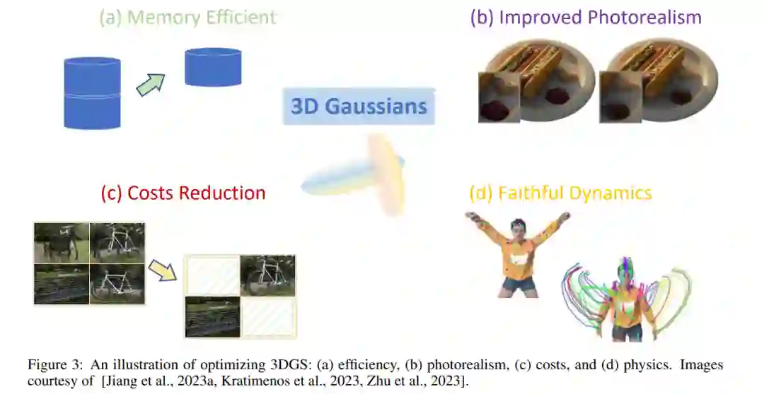 高斯内在属性优化尽管3D高斯喷溅的能力和效率已经得到展示,但在以下有希望的方向上仍有进一步精细化的空间(如图3所示):(a)使3D-GS更加内存高效对于实时渲染至关重要;(b)渲染图像的质量可以进一步提高;(c)减少合成新视角图像的成本;(d)使3D高斯能够以忠实的动态表示动态场景。
