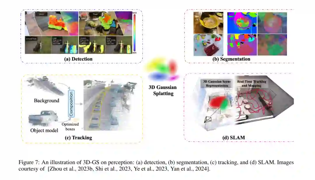 利用3D-GS,3D感知有潜力增强开放词汇的语义对象检测和定位(图7a)、3D分割(图7b)、移动对象的跟踪(图7c)以及同时定位与映射(SLAM)系统的开发(图7d)。