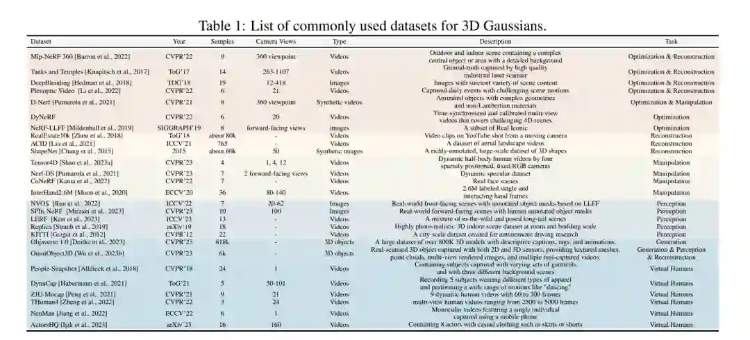 3D高斯溅射在计算机图形学和计算机视觉领域展示了显著的潜力。然而,由于3D高斯溅射相关的复杂结构和多样化任务,各种挑战依然存在。本节旨在解决这些挑战,并提出未来研究的潜在途径。本文提供了关于3D高斯溅射的全面且最新的综述,总结了现有的方法及其应用。我们首先回顾了专注于优化3D-GS以提高效率、真实感、成本和物理性能的论文。随后,我们系统地探索了3D-GS的五个主要应用,包括重建、操作、生成、感知和以人为中心的应用。最后,我们深入讨论了这一领域的挑战和潜在的未来发展方向。此外,我们提供了方法的比较总结,为3D视觉和计算机图形学的研究者提供了宝贵的资源。