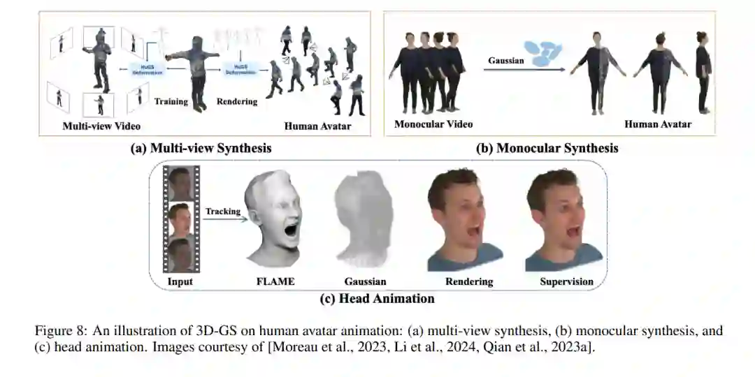 通常,基于3D高斯的方法从使用SMPL模板初始化高斯开始,然后使用线性混合蒙皮(LBS)将表示变形到观察空间。然后通过多视图(图8a)或单眼视频(图8b)渲染和监督高斯。此外,一些方法专门在重建人类头部头像(图8c),而一些则专注于通用管道而非针对个体的优化。