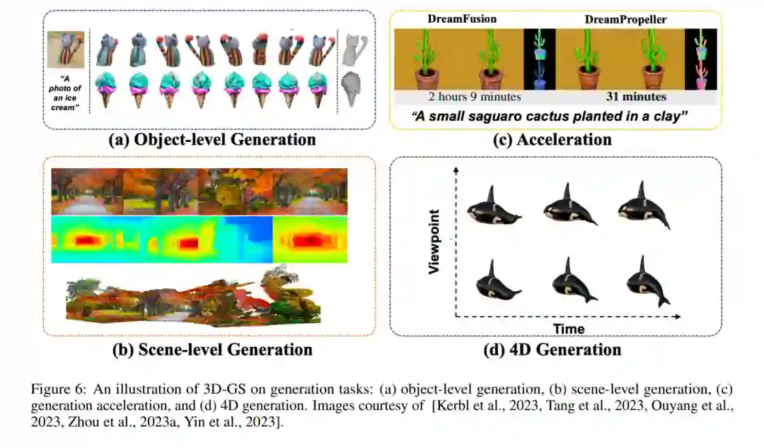 得益于在扩散模型和3D表示方面取得的重大进步,现在从文本/图像提示生成3D资产成为AIGC领域中的一个有前途的任务。此外,使用3D-GS作为对象(图6a)和场景(图6b)的显式表示,使得快速甚至实时渲染成为可能。除此之外,一些工作专注于改进得分蒸馏采样(SDS)管道(图6c)中固有的耗时优化过程。虽然3D生成已经展示了一些令人印象深刻的结果,但4D生成(图6d)仍然是一个具有挑战性和尚未充分探索的话题。