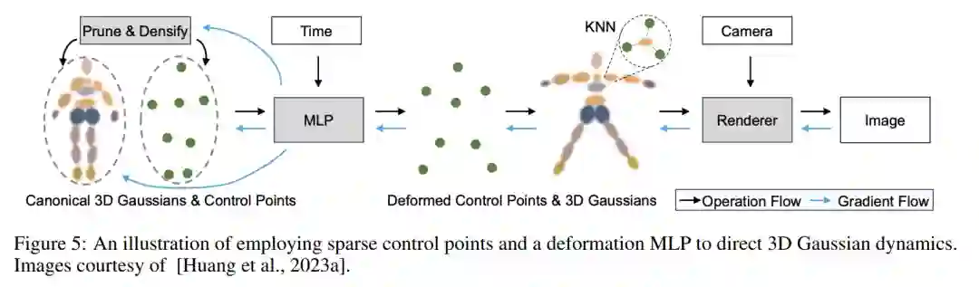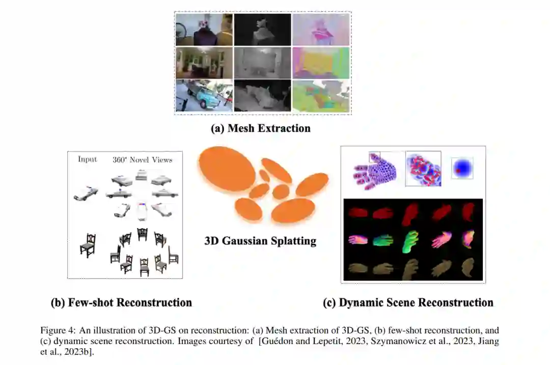 重建如前所述,3D-GS在捕获和从新的视角渲染3D场景中的广泛采用,可以归因于其卓越的渲染速度和产生逼真结果的能力。与NeRFs类似,3D-GS中表面网格的提取(如图4a所示)是一个基本但至关重要的方面。进一步的调查是必要的,以解决挑战性场景,例如单目或少镜头情况(如图4b所示),这些在实际应用中常见,如自动驾驶。此外,3D-GS的训练时间在数分钟的数量级,使得实时渲染成为可能,并促进了动态场景的重建(如图4c所示)。