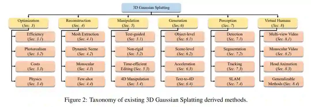 **本综述的结构如下组织:第2节提供了3D高斯喷溅的背景知识介绍。第3节系统回顾了用于优化3D-GS的方法,包括渲染效率、渲染图像的真实性、成本以及3D-GS涉及的物理考虑。另外,第4节回顾了最近提出的用于重建网格的方法,而第5节比较和总结了用于操纵3D-GS的技术。进一步地,第6节从对象级和场景级的视角检查了3D生成的方法。此外,第7节和第8节分别提供了3D-GS在感知和人体研究中的应用总结。最后,第9节识别了几个3D-GS的有希望的未来方向。