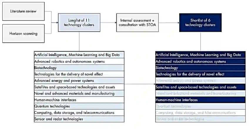 在范围界定活动、视野扫描和文献回顾的基础上,研究小组综合了所有捕获的数据,并将审查来源中评估的技术分类为可能在 11 个技术集群中塑造未来战场。其中六个技术集群随后被在内部分析和与STOA协商的基础上,入围进一步深入审查和比较分析。该咨询考虑了两个选择标准,即采用的可能性和技术集群在 2040 年时间范围内在战场环境中的预期影响程度。 图 1.2 显示了技术选择过程。