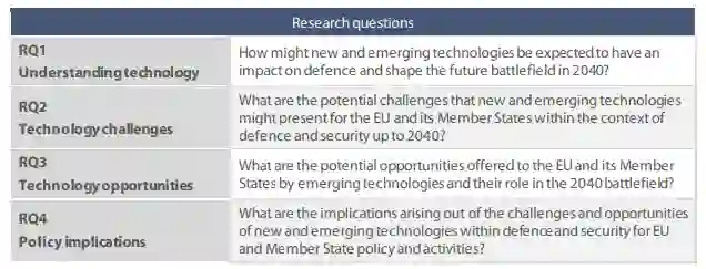 • WP4 – 影响和报告旨在确定欧盟及其成员国在 2040 年战场(RQ4)上与新兴技术相关的挑战和机遇所产生的关键政策影响。