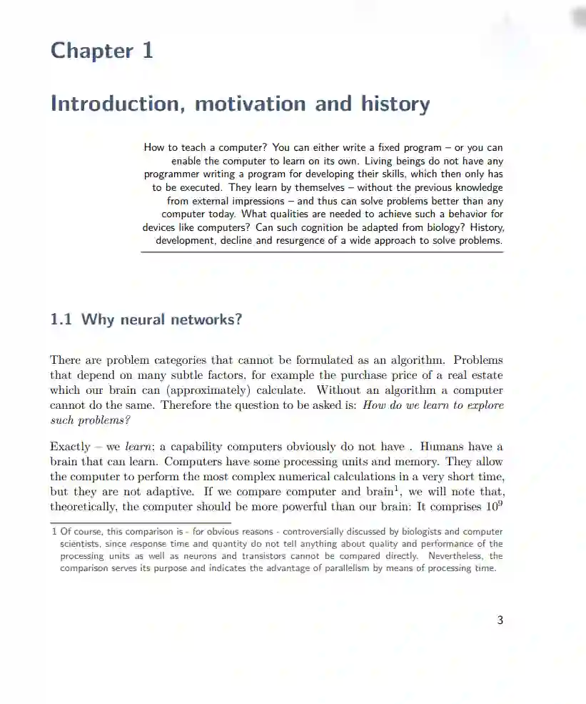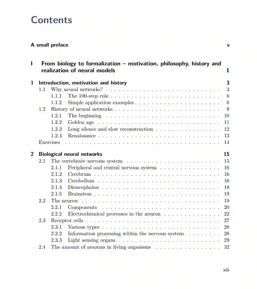 神经网络是一种受生物启发的数据处理机制,它使计算机能够在技术上类似于大脑的学习,甚至在传授足够多的问题实例的解决方案时进行归纳。手稿“A Brief Introduction to Neural Networks”被分成几个部分,这些部分又被分成章节。下面对每章的内容进行总结。 第一部分:从生物学到形式化 -- 神经模型的动机、哲学、历史和实现 引言、动机和历史 如何教计算机?你可以编写一个严格的程序 - 或者你可以让计算机自己学习。生物没有程序员为它们编写程序来开发技能,只需执行。它们通过自己学习 - 没有初始经验和外部知识 - 因此可以比任何现今的计算机更好地解决问题。什么样的品质需要让像计算机这样的设备实现这种行为?这种认知能力能从生物学中获得吗?解决问题的广泛方法的历史,发展,衰退和复兴。 生物神经网络 生物系统如何解决问题?神经元系统是如何工作的?我们如何理解其功能?不同数量的神经元能做什么?神经系统中哪里在处理信息?关于神经信息处理的简单元素的复杂性的简短生物学概述,后面是一些关于如何简化它们以便在技术上适应它们的想法。 人工神经网络的组成部分 对实现生物神经网络技术适应的组件的正式定义和通俗解释。如何将这些组件组合成神经网络的初步描述。 如何训练神经网络?如何教授机器的方法和思考。应该纠正神经网络吗?他们应该只被鼓励吗?或者他们甚至应该在没有任何帮助的情况下学习?关于我们在学习过程中想要改变什么以及我们将如何改变它的思考,关于错误的测量以及何时学到足够的东西。 第二部分:有监督学习网络范式 感知机 神经网络中的经典之一。当我们谈论神经网络时,在大多数情况下,我们指的是感知机或其变种。感知机是没有循环并且具有固定输入和输出层的多层网络。描述感知机,其限制以及应避免这些限制的扩展。学习过程的推导和关于它们问题的讨论。 径向基函数 RBF网络通过拉伸和压缩高斯函数,然后空间上移动它们来近似函数。描述它们的功能和学习过程。与多层感知机进行比较。 递归多层感知机 关于具有内部状态的网络的一些想法。使用这种网络的学习方法,以及它们动态的概述。 霍普菲尔德网络 在磁场中,每个粒子对任何其他粒子施加力,使所有粒子以能量最为有利的方式调整其运动。这种自然机制被复制用来调整噪声输入,以使其匹配其真实模型。 学习矢量量化 学习矢量量化是一种学习过程,目的是通过使用少量代表性矢量尽可能地复制划分为预定义类的矢量训练集。如果这样做成功,那么迄今为止未知的矢量可以轻松分配给这些类别中的一个。 第三部分:无监督学习网络范式 自组织特征映射 一种无监督学习神经网络的范式,通过其固定的拓扑结构映射输入空间,从而独立寻找相似性。功能,学习过程,变化和神经气体。 自适应共振理论 原始形式的ART网络应对二进制输入向量进行分类,即将它们分配给1-out-of-n输出。同时,到目前为止未分类的模式应被识别并分配给一个新类别。 第四部分:专题研究,附录和目录 簇分析及区域和在线学习域 在格林姆的词典中,已经灭绝的德语词“Kluster”被描述为“was dicht und dick zusammensitzet(某物的浓密群体)”。在静态簇分析中,探索点云内部群组的形成。介绍一些程序,比较它们的优点和缺点。讨论一种基于神经网络的自适应聚类方法。一个区域和在线可学习的字段从点云(可能包含大量点)中建模,用一组相对较少的神经元代表点云。 用于预测的神经网络 讨论神经网络的一个应用:预见时间序列的未来。 强化学习 如果没有训练示例,但仍然可以评估我们学习解决问题的效果如何呢?让我们看一下位于监督学习和无监督学习之间的学习范式。