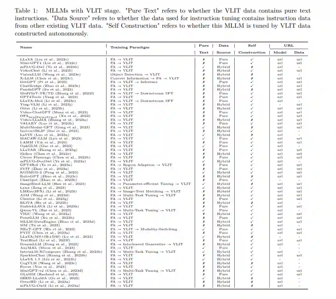 在这一部分,我们简要介绍VLIT的相关定义,并收集近期MLLMs及其对应的VLIT数据集。 正如图2所示,我们在这一节中组织了所有与VLIT数据相关的工作。MLLMs及其相应的VLIT数据集的具体统计信息可以在表1和表2中找到。