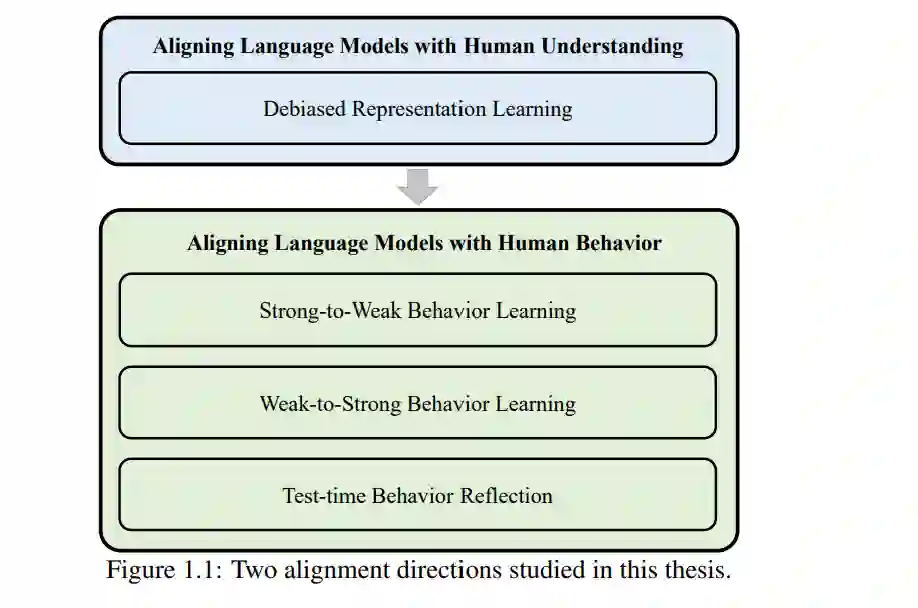 语言模型(LM)在自然语言处理领域取得了显著进展,但它们仍与人类的理解和行为存在偏差,从而限制了其在现实应用中的有效性。本论文从两个角度探讨了语言模型对齐的问题:其一是使模型的理解与人类对齐,其二是使模型的行为与人类对齐。具体而言,我们围绕四个关键主题展开研究:(i)通过去偏表示学习实现理解对齐;(ii)通过“强对弱”学习实现行为对齐;(iii)通过“弱对强”学习实现行为对齐;(iv)通过测试时行为反思实现行为对齐。 我们首先聚焦于微调过程中的表示对齐,提出了一个能够减少偏倚潜在特征并捕捉其动态影响的框架,从而提升模型在分布外数据上的泛化能力。接着,在“强对弱”学习的设定下,我们提出了一种行为对齐方法,用于提升知识密集型任务中的完整性、事实性和逻辑性,该方法融合了细粒度与粗粒度的知识信号。随后,我们研究了“弱对强”对齐的情境,即更强大的语言模型需从较弱的人类监督中学习。为此,我们引入了一种迭代式偏好优化策略,促进“弱教师”与“强学生”之间的互学机制。最后,我们在推理阶段关注模型行为的对齐,尝试缓解语言模型决策中的认知偏差。我们提出了一种包括三个连续步骤的方法——偏差识别、偏差分析与认知去偏——以迭代方式减少提示中的潜在认知偏差。 语言是人类的一项基本认知能力,使我们能够理解并交流多样且复杂的概念,这一能力使智人(Homo sapiens)有别于其他所有物种【59, 78, 104, 105, 218】。大约在五千年前,人类发明了书面语言【9, 131】,从而实现了信息在时间与空间上的保存与传播【93, 288】。在此基础上,自然语言处理(NLP)作为一个致力于使机器理解与生成自然语言的研究领域逐步发展起来【276】。早期的 NLP 系统主要依赖基于规则的方法,但自然语言本身的复杂性与歧义性带来了巨大挑战【110, 188】。近年来,语言模型(LM)取得了突破性进展,这主要得益于 Transformer 神经网络结构的提出【285】,以及模型规模、数据规模和训练时长的显著扩展【134】。 由此诞生的预训练语言模型(如 BERT【62】和 GPT-4【208】)构成了强大的通用语言理解与生成基础,可以方便地适配多种自然语言理解(NLU)【26, 272, 312】与自然语言生成(NLG)任务【28, 209, 221】。 强大语言模型的发展通常经历三个关键阶段:(i)预训练:语言模型通过自监督学习在大规模文本语料上进行训练,从中捕捉语言模式、结构与世界知识【124, 275】,这一阶段为语言模型提供了全面的语言与语境理解能力。(ii)微调:通过监督微调与偏好优化,在标注数据集上对预训练模型进行领域特定的适配【71, 209, 223】,以提升其在特定领域的性能,同时使其行为更符合人类偏好,并具备更强的指令跟随能力。(iii)提示工程:通过策略性设计任务特定的自然语言提示(prompts),实现对语言模型的调用,而无需修改模型参数【28, 305, 354】。尽管取得了诸多进展,近期研究发现语言模型在语言理解【23, 86, 101】和生成行为【29, 126, 273】方面仍存在对齐偏差,这些问题最终影响其有效性与可靠性。因此,本论文探索语言模型与人类理解及行为的对齐,如图 1.1 所示,重点关注微调与提示工程阶段。 我们首先探讨微调阶段语言模型与人类理解的对齐。虽然经过微调的语言模型【62, 168】在许多 NLU 基准任务(如自然语言推理,NLI【26, 312】)上取得了优异表现,研究表明这些模型往往依赖数据集中的偏差特征,而非人类真正关心的、与任务相关的语义特征【68, 190, 240】。例如,Gururangan 等人【101】发现,在 NLI 数据集中,语言模型倾向于利用负面词汇(如 nobody、no、never、nothing)与“矛盾”标签之间的虚假关联进行预测,导致模型在缺乏这种偏差的分布外数据上表现不佳。因此,我们旨在开发去偏表示学习方法,以减少表示中的偏差特征,并推动模型编码更多符合人类意图的、与任务相关的特征。 接下来我们研究语言模型在微调阶段与人类行为的对齐,尤其是在所谓的“强对弱”设定下。该设定的问题在于:经过微调的语言模型在处理复杂的知识密集型问答任务时,常常难以有效利用相关知识【16, 32, 42, 335】。已有研究表明,语言模型可能产生不完整的答案(知识覆盖不足)【25, 253, 321】,事实错误的答案(内容不符合事实)【197, 290, 291】,或逻辑混乱的答案(结构不连贯)【42, 132, 362】。这些问题源于模型在常规微调过程中缺乏对知识的深入理解。为了解决上述问题,我们提出了一种“强对弱”学习方法,以增强模型在微调过程中的细粒度与粗粒度知识感知能力。 随后,我们进一步探讨更具挑战性的“弱对强”设定下语言模型与人类行为的对齐问题。在这一设定中,目标是用由较弱人类智能体生成的弱标签,对更强大的语言模型进行微调。随着微调语言模型在某些任务上逐渐接近甚至超越人类水平【29, 31, 83】,使其行为符合人类价值观变得愈发紧迫。在语言模型能力超过人类的情境中,我们面临一个“弱对强”对齐问题:如何用噪声较大的弱监督信号,去有效对齐更强的模型。因此,我们探索“弱对强”学习方法,推动“弱教师”与“强学生”之间的互学机制,即通过迭代强化模型未熟悉的积极行为,并惩罚其熟悉的消极行为。 最后,我们将注意力转向测试阶段的提示工程,研究如何在该阶段实现语言模型行为与人类的对齐。语言模型在辅助决策方面展现出巨大潜力,尤其是