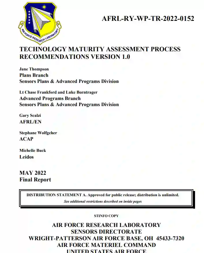 目前缺乏一种系统的方法来评估AFRL技术,也缺乏对任何评估的文件验证。虽然这并不是转型失败的原因,但有条不紊、准确和可验证的TRL评估过程有助于为其他多个过程奠定基础;支持与其他科技专业人士、管理机构和潜在的转型伙伴进行有意义的合作;并支持提高AFRL技术转型的概率。这些其他过程包括技术成熟计划(TMP)、推进难度(AD2)、制造准备水平(MRL)、集成准备水平(IRL)、系统准备评估和水平(SRA和SRL)、空军未来(HAF/A57,正式的空军作战人员集成能力(AFWIC))。技术、任务、资源、组织(TMRO)方法,AFRL过渡指标(ATM)和项目管理审查(PMR)。
