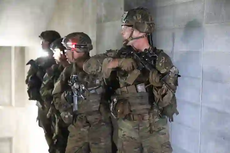 图 第 3 步兵师第 28 步兵团第 1 营的士兵在日本 Aibano 训练区的城市地形军事行动训练中等待另一个小队清理一个房间,同时与日本地面自卫队成员进行双边演习-国防军第 15 快速部署团在 2021 年 6 月 7 日 21 日至 2 日的东方之盾演习中。东方之盾是美国陆军和 JGSDF 最大的双边野战训练演习,正在日本各地进行,以增强互操作性并测试和完善多域和跨域作战。