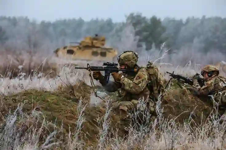 图 2022年11月23日,在波兰Bemowo Piskie举行的Bull Run实弹演习中,被分配到第1骑兵师第3装甲旅战斗队第8骑兵团混沌连的士兵在一辆布雷德利战车的火力支援下向目标前进。