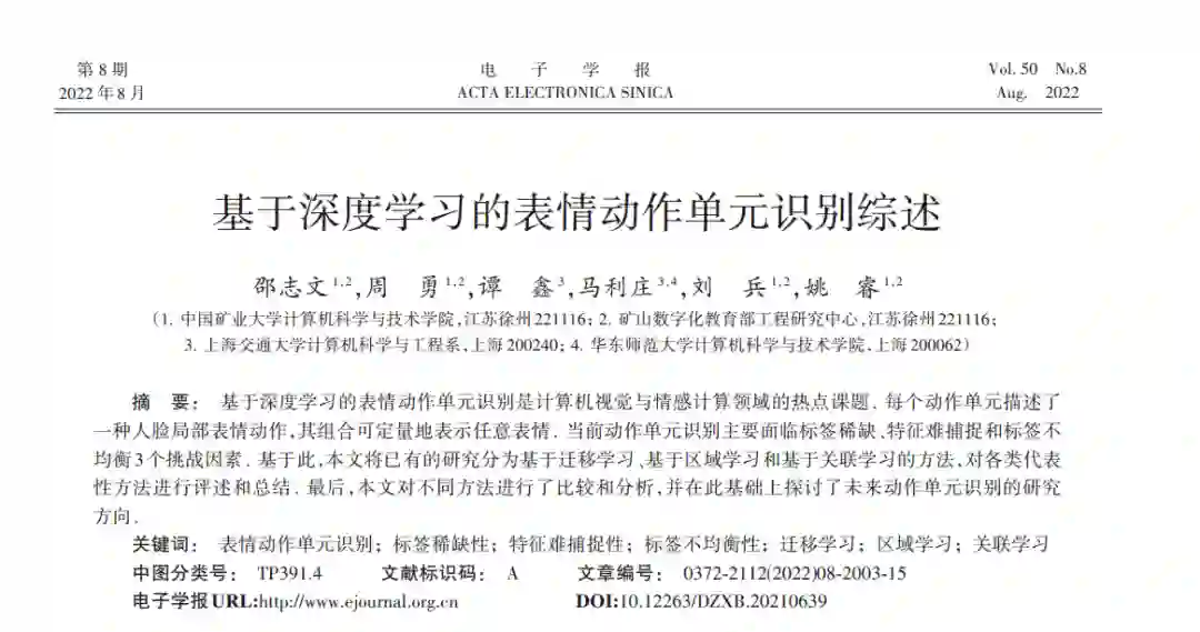 基于深度学习的表情动作单元识别是计算机视觉与情感计算领域的热点课题.每个动作单元描述了一种人脸局部表情动作,其组合可定量地表示任意表情.当前动作单元识别主要面临标签稀缺、特征难捕捉和标签不均衡3个挑战因素. 基于此,本文将已有的研究分为基于迁移学习、基于区域学习和基于关联学习的方法,对各类代表性方法进行评述和总结. 最后,本文对不同方法进行了比较和分析,并在此基础上探讨了未来动作单元识别的研究方向.