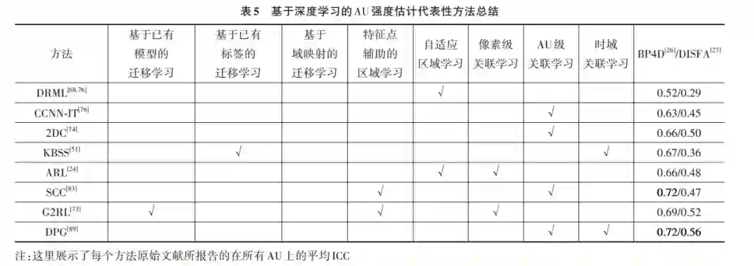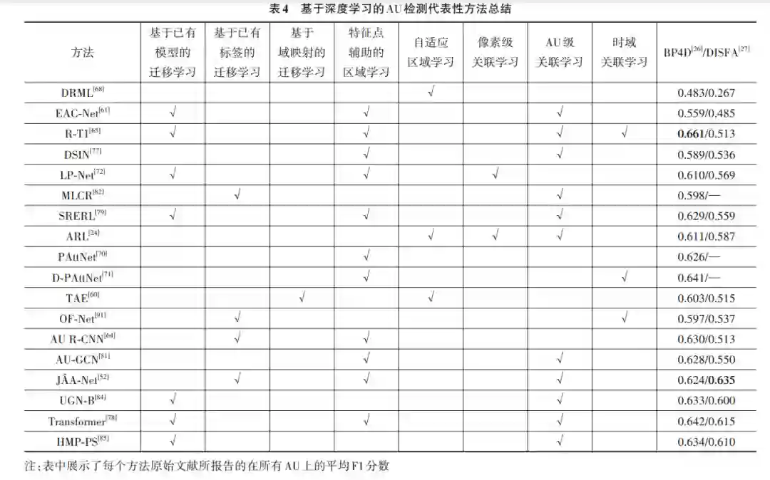 表 4、表 5 分别对代表性的基于深度学习的 AU 检 测和AU强度估计方法进行了总结和对比,从中可以观 察到如下几方面的现象.