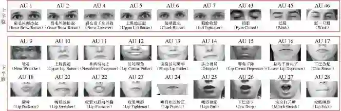 人脸表情出现时,一些局部区域会发生肌肉动作.人脸动作编码系统(FACS)[6,7]基于人脸解剖学所划分的局部肌肉,定义了一个基本面部动作即动作单元(AU)的集合.每个AU涉及一个或多个局部肌肉,具有0,1,2,3,4,5这6个强度级别,其中0表示不出现而5则表示出现的强度最大,因而可以客观且定量地描述人脸精细表情.图2展示了常见的27个AU的示例图片及定义,其中9个AU出现在上半脸,18个AU出现在下半脸.可以发现,每个AU都是一种局部的面部动作,刻画了细微表情.形式化地,任一人脸表情可以由这些AU出现的强度所构成的向量