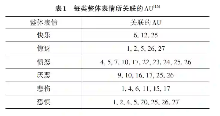 经过观察,AU 的组合可以形成 7 000 多种真实存 在的表情[8] . 在某一人脸表情中,可能单独出现一个 AU,也可能同时出现多个 AU. 当多个 AU同时出现时, 若它们是可加性的(Additive),则 AU 的组合出现并不 改 变 各 AU 的 外 观 ;若 它 们 是 不 可 加 性 的(NonAdditive),即它们的肌肉动作存在交叠区域,会融合成 新的肌肉动作,则各 AU 的外观会被改变 . 此外,一些 AU 组合如 AU 1 和 AU 4 在悲伤和恐惧表情中都会出 现,比其他组合出现的频率更高. 另外,某些AU之间是 相互排斥的,如 AU 1 和 AU 7,两者不会同时出现在任 一表情中,若一个AU出现则另一个AU不会出现。
