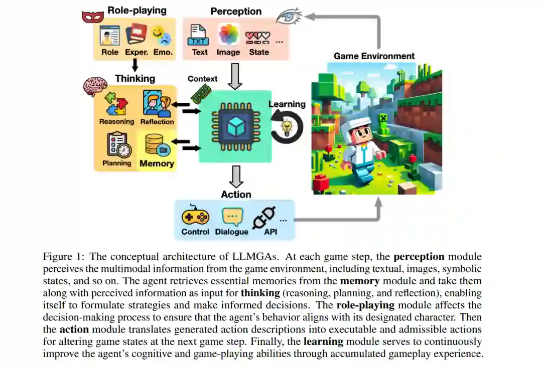 图1提供了LLMGAs的概念架构,包括六个基本功能组件及其工作流程:对于每个游戏步骤,感知模块捕获游戏状态信息,为智能体理解其当前环境提供必要的数据。思考模块处理感知到的信息,基于推理、规划和反思生成思考,以便做出明智的决策。记忆作为一个外部存储,过去的经验、知识和精心挑选的技能被保留,并可以为将来使用而检索。角色扮演模块使智能体能够在游戏中模拟特定角色,展示与每个角色的特征和目标一致的可信行为。行动模块将生成的文本决策转换为可执行的动作,允许智能体有效地与游戏元素互动和操纵。学习模块通过在游戏环境中积累的经验和互动,不断改善智能体的认知和游戏技能。