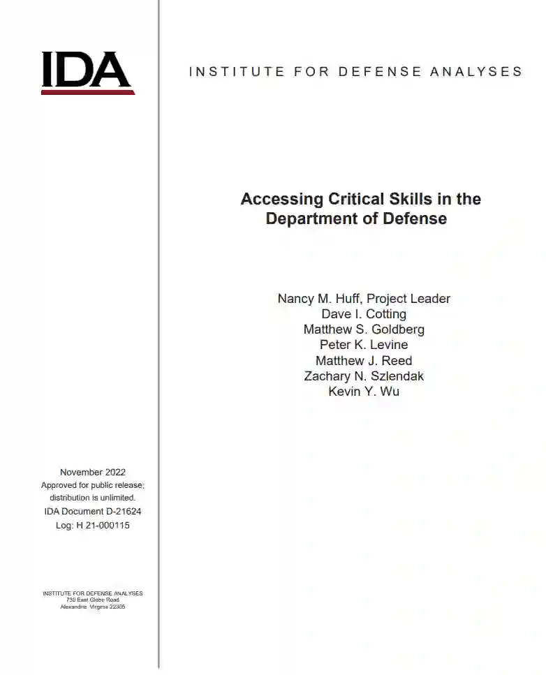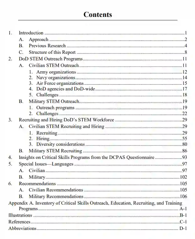 认识到高技能劳动力对国家安全任务的极端重要性,参议院关于2020财政年度(FY)国防授权法案的第116-48号报告要求向参议院和众议院的军事委员会提交一份报告,评估国防部教育和招聘关键技能人员的计划,包括网络安全、STEM、创新、计算机科学和关键语言。作为回应,人事和战备副部长办公室(OUSD(P&R))的文职人员政策主任要求国防分析研究所(IDA)确定导致现有国防部招聘和发展计划成功或失败的共同因素,以改善文职和军警人员队伍中关键技能的可用性。此外,IDA还被要求就如何改进当前和未来的招募和教育计划提出建议。