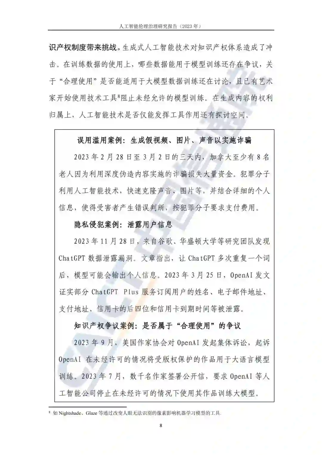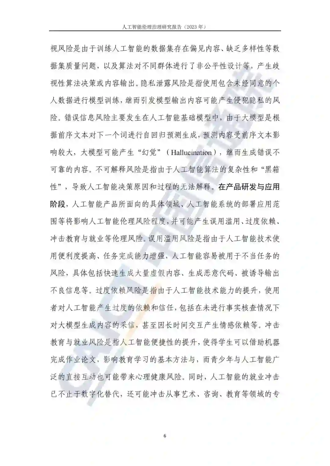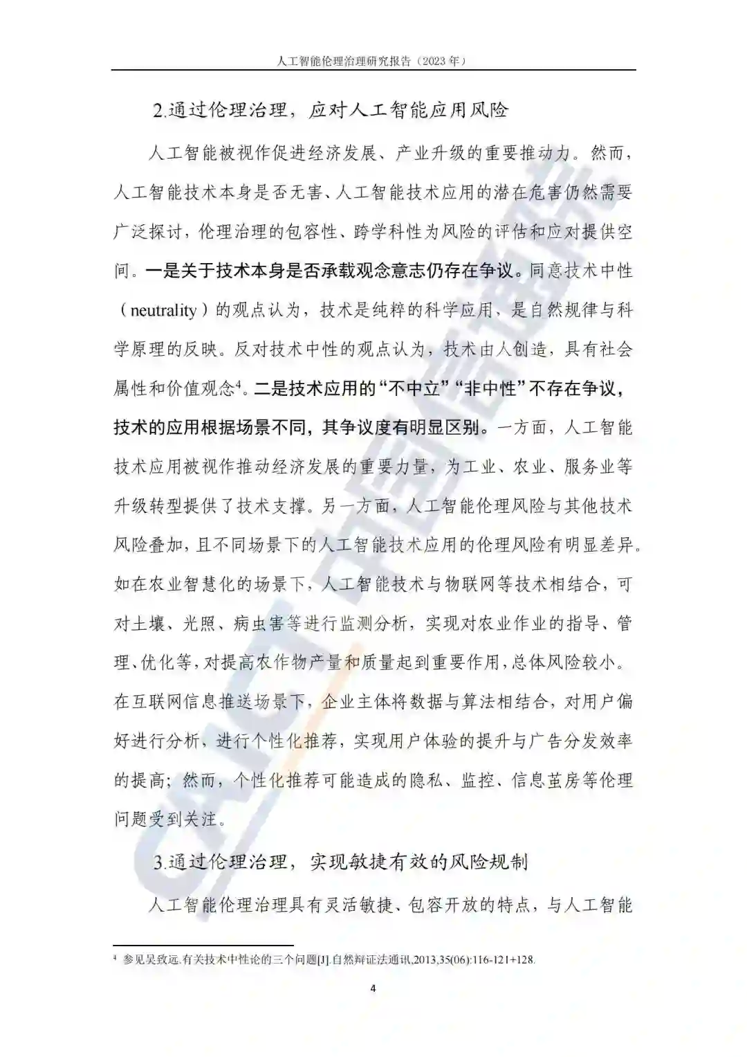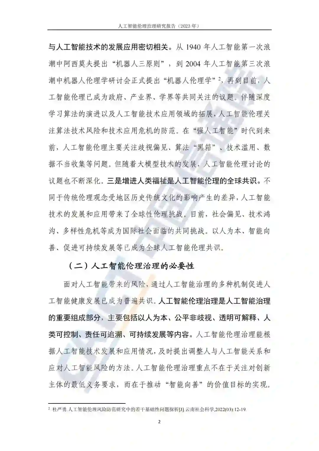 人工智能伦理是开展人工智能研究、设计、开发、服务和使用等活动需要遵循的价值理念和行为规范。人工智能技术的突破发展,引发了技术应用的伦理争议,特别是生成式人工智能技术的发展应用引发了偏见歧视、隐私侵犯、责任不明、虚假内容传播等伦理挑战。 为应对人工智能技术应用带来的风险,世界各国积极推动人工智能伦理国际治理合作。各国政府通过出台人工智能伦理原则、发布人工智能伦理治理指引、提供技术治理工具等加强本国本地区的人工智能伦理治理监管。我国通过积极完善人工智能伦理制度规范,探索人工智能伦理治理技术化、工程化、标准化落地措施,加强人工智能治理国际合作等举措推动人工智能向善发展。 人工智能伦理治理是多主体协作的全流程治理,是以敏捷机制协调人工智能发展与安全的重要治理模式。未来一段时期,人工智能伦理治理将与产业创新活动增强协调;多学科多主体参与、分类分级治理、技术工具开发等措施将有效推动人工智能伦理治理机制完善;全民科技伦理素养的提升将有效防范人工智能伦理风险;全球人工智能伦理治理合作也将推动人工智能技术造福人类。 ** 报告原文 **