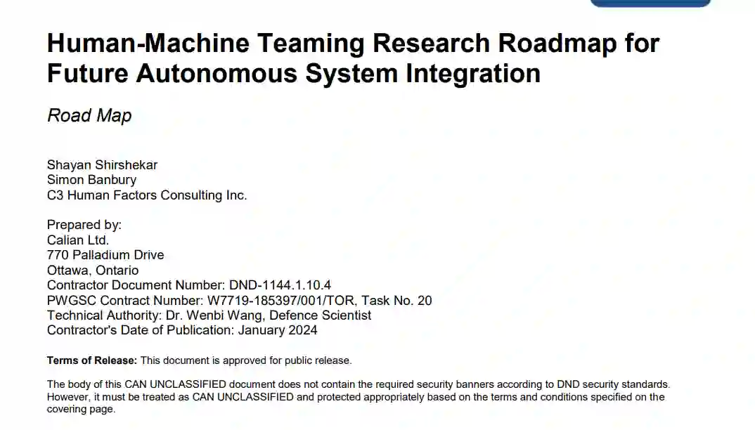 本研究中制定的研究路线图将有助于指导 DRDC 未来的研发活动,以解决自主系统集成中的 HAT 问题,并为调查 HAT 实验测试平台(如合成和/或物理实验平台)的操作要求奠定基础,以便开展未来的 HAT 实证研究。