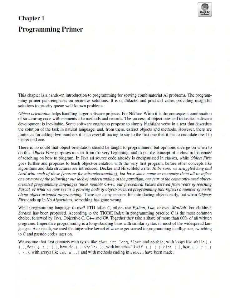 书的第一部分介绍了基础知识。作者从一个解决组合问题的动手编程入门开始,重点在递归解决方案。书的第一部分的其它章节解释了最短路径、排序、深度学习和蒙特卡罗搜索。