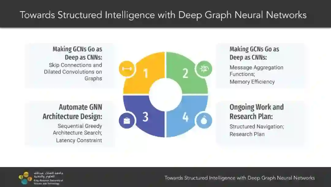 本论文旨在解决图神经网络(GNN)架构中的核心问题之一。具体来说,论文研究了训练和设计非常深层次的GNN模型的技术,并将这些深层GNN模型应用于跨领域的各种大规模应用。我们首先提出了用于训练深层GNN的跳跃连接和扩张卷积。然后,我们讨论了消息聚合函数在训练深层GNN时的影响,并提出了可微分的消息聚合函数。为了使训练更深层次的GNN成为可能,我们研究了可逆连接、组卷积、权重绑定和平衡模型等技术,这些技术使得可以训练具有1000多层的GNN。最后,我们开发了一种新颖的神经架构搜索算法,以实现自动设计有效和高效的GNN架构。