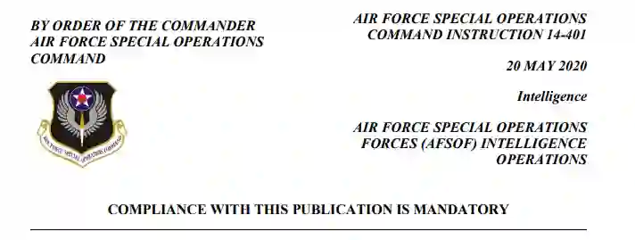 本出版物执行空军政策指令(AFPD)14-4《空军情报、监视、侦察和网络效果行动企业管理》,并与空军指令(AFI)14-1020《情报任务资格和准备情况》相一致。本出版物规定了空军特种作战部队(AFSOF)所有从事情报作业人员的培训和资格认证的最低标准。本出版物适用于所有支持空军特种作战部队行动的正规空军(RegAF)、预备役和空军国民警卫队(ANG)的情报人员。在本指令中,国民警卫队局(NGB)被视为一个主要指挥部(MAJCOM)。本出版物不适用于第724情报中队。