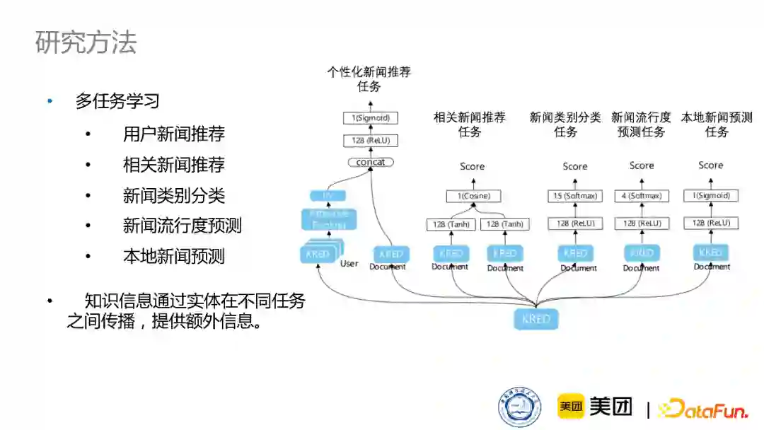 同时我们的框架也可以采取一种多任务学习的方式,因为对于不同的新闻推荐任务来说,任务之间的各种标签会提供一些额外的信息。比如我们通过本地新闻预测任务,来预测新闻是不是与本地相关。在此任务中,知识实体也可以提供不同程度的帮助,有些知识实体是地点,对于本地新闻预测任务就会起到很好的帮助。并且,不同的新闻任务之间也会传递一些信息,通过知识实体来把不同任务之间的标签进行传递,从而对不同任务起到促进作用。