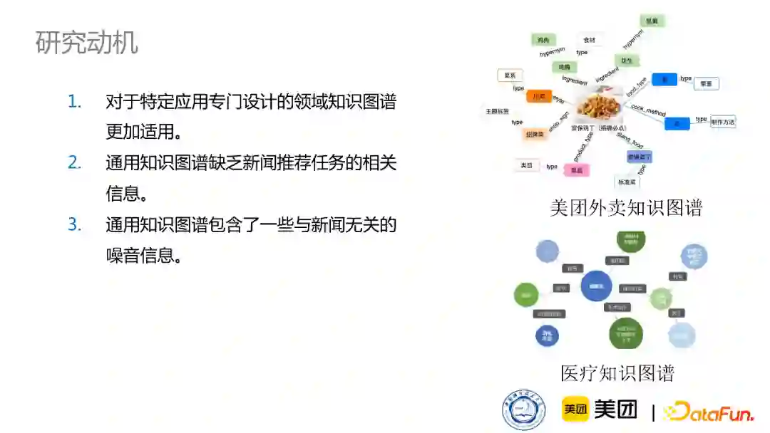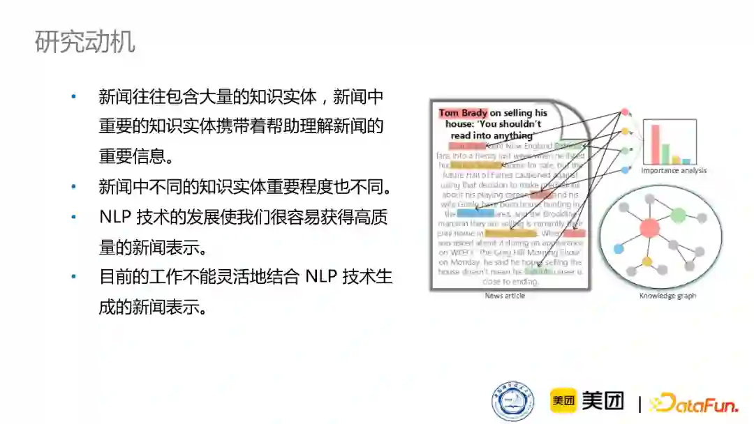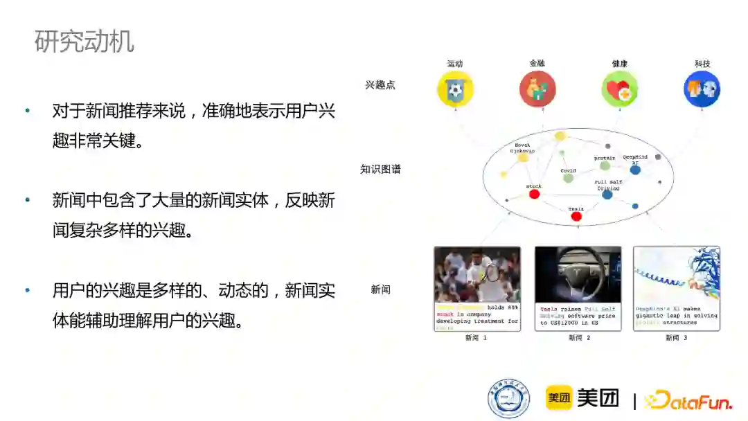 接下来介绍我在美团做的工作,我的工作主要动机有三个: 首先,上文讲述了如何通过知识图谱增强新闻的表示,但对于新闻推荐来说,准确地表示用户兴趣也非常关键,所以我们更深层次地研究如何利用知识图谱来更加全面地建模用户在新闻阅读过程中的兴趣的表示。 其次,新闻中其实包含了大量的新闻实体,这些实体能反映一篇新闻复杂多样的兴趣。新闻不同于商品,内容更加复杂,一篇新闻中往往会包含各种各样的兴趣,所以引入知识可以更加全面地了解一篇新闻的兴趣。在此基础上,我们就可以进一步了解用户的多样的、动态的兴趣。