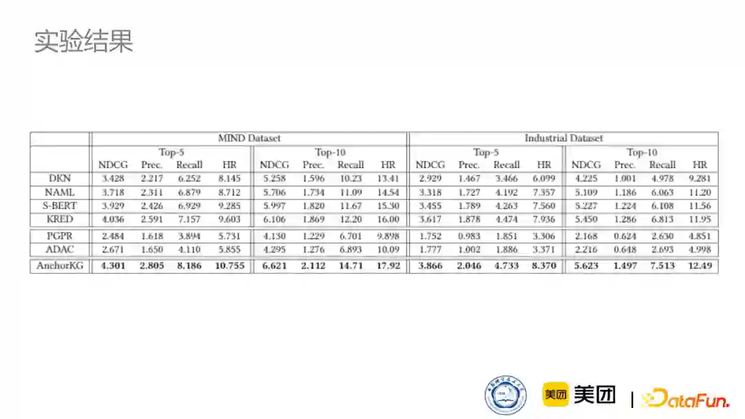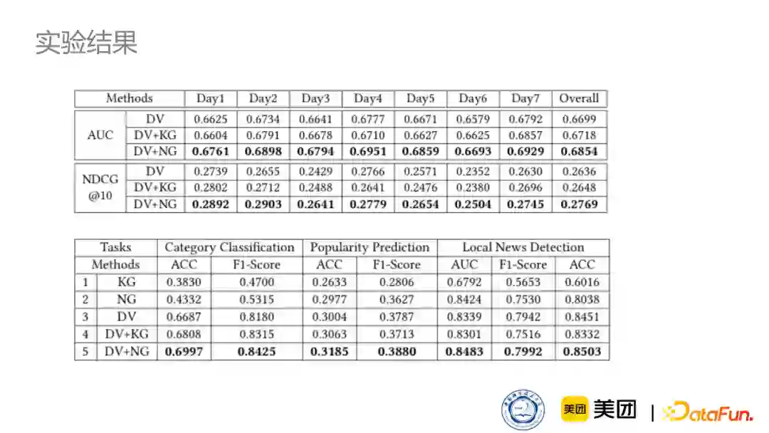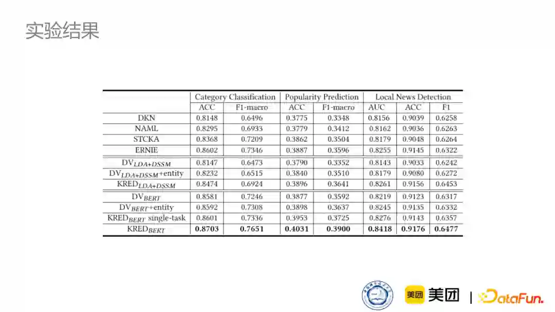 我们选取了MSN新闻四周的语料用来测试我们通用知识图谱和新闻知识图谱,进行对比。同时我们在多种推荐任务上都进行了测试,比如我们最擅长的个性化新闻推荐任务还有新闻分类任务。