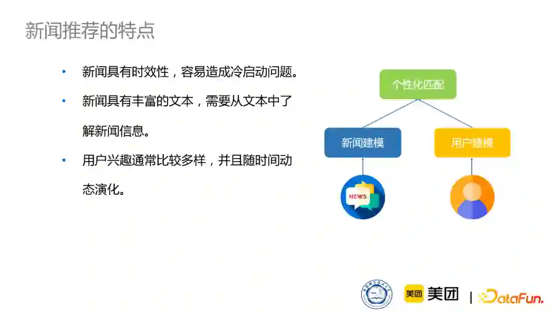 新闻推荐系统与其他推荐系统相比,还是存在非常鲜明的不同点的。 * 首先,新闻推荐有很强的时效性,比如我们不会关注一周前发生了什么新闻,只关心今天发生了什么新闻,这样会造成非常严重的冷启动问题。 * 其次,理解新闻内容本身的内容是非常重要的。新闻里包含了大量的知识实体,比如人名、地名、事件等等,而知识图谱可以给新闻带来一个非常好的补充,因此知识图谱对新闻推荐有独特的重要意义。 * 最后,用户在阅读新闻的时候,兴趣也是多样的,比如既关心政治又关心体育。并且随着时间推移以及热点新闻的不断出现,他们的兴趣也会发生一些动态的演化。