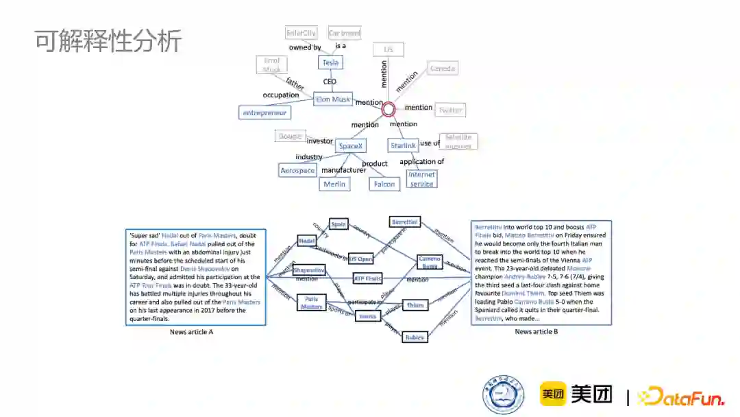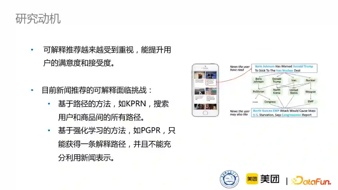 首先,新闻中包含了大量的实体,并且新闻知识图谱也比商品知识图谱要复杂得多,比如新闻知识图谱关系可能有上千种,但亚马逊的商品知识图谱可能只有十几种关系。因此,对于如此复杂的数据和图,如何生成可解释路径是非常有挑战性的工作。 现在也有一些解决的方法,有基于路径的方法,比如KPRN模型,它先搜索用户和商品之间所有的路径,然后对所有路径进行打分,再进行排序,最终选择比较优秀的可解释路径。还有一些基于强化学习的方法,比如PGPR模型,它从用户出发,进行游走,游走到一个item后,就把这个游走的路径作为一个可解释路径。不过新闻中包含了大量实体,所以如果在用户与新闻之间,只给出一条可解释路径,可能会与用户在阅读新闻时关注的地方不同。这样的话,也会造成不全面的问题。