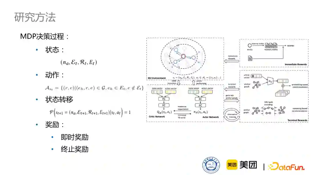 并且我们也采取了多种学习策略来使它更容易学习。首先是热启动训练,我们会选取一个小数据集,去枚举一些路径,通过这个路径来产生监督学习的label,再通过这些label来去初始训练actor-critic网络。同时因为新闻知识图谱比较复杂,对于两篇新闻来说,如果我们选取到完全不相关的两篇新闻作为负样本的话,可能学习不到有用的信息。因此我们采取了在知识图谱上进行游走的策略,让它能更加有效地学习。最后我们会联合训练推荐任务和推理任务,来达到一个多任务学习的更好的效果。