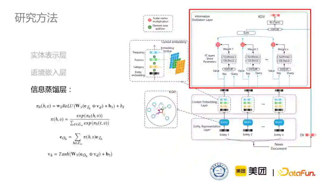 为此,我们设计了一个模型,该模型主要核心有三层:实体表示层、语境嵌入层、信息蒸馏层。通过这三层,给根据NLP模型得到的新闻表示DV注入一个知识实体的信息,得到一个知识增强的新闻表示。 第一层是实体表示层。首先,把出现在这篇新闻中的实体通过预训练的方式取出,但是不同的实体在知识图谱中有各种各样的邻居,这些邻居也能够丰富它的表示,因此我们采取一种KGAT的方式,通过考虑它不同的关系,来聚合它的邻居信息,从而得到更全面的出现在新闻中的实体表示。