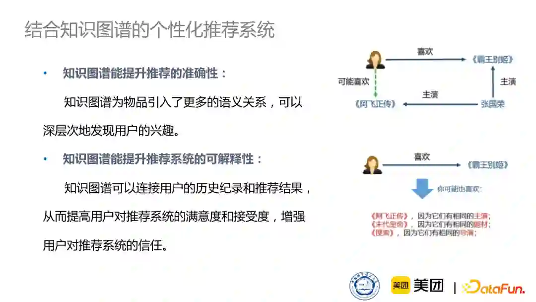 首先,知识图谱为物品引入了更多的语义关系,可以更深层次地发现用户的兴趣。比如用户看一个电影,通过知识图谱就可以知道电影的各种各样的信息,因此通过知识图谱就可以引入高质量的信息,包括用户的表示。同时,因为知识图谱是构建非常优良的图结构,通过连接用户和商品、商品和商品,就可以找到非常有意义的路径,并通过这些路径来构建可解释理由。因此,通过知识图谱就可以在给出推荐的同时,也给出推荐的理由,增强用户对推荐系统的满意度和接受度。