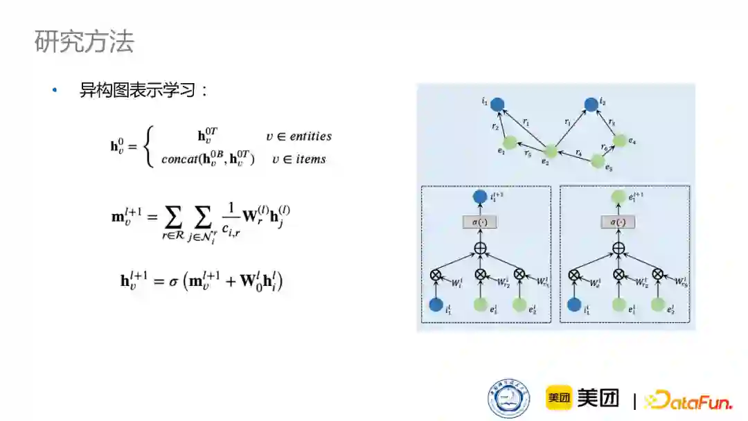 同时,我们也补充了一些跟新闻相关的特定信息,比如用户在阅读新闻的时候,会非常关注新闻的主题,并且每个用户的兴趣都是比较固定的,比较喜欢某一类的新闻。因此,主题对新闻推荐来说,是至关重要的。所以,我们增加了两种类型的主题节点:显式主题节点、隐式主题节点。